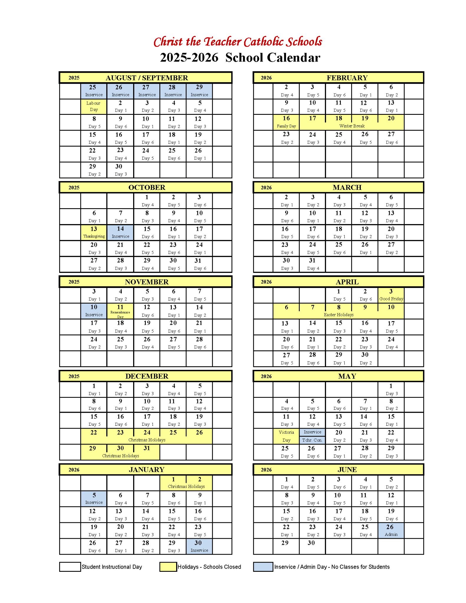 2025-2026 Christ the Teacher Catholic Schools Calendar