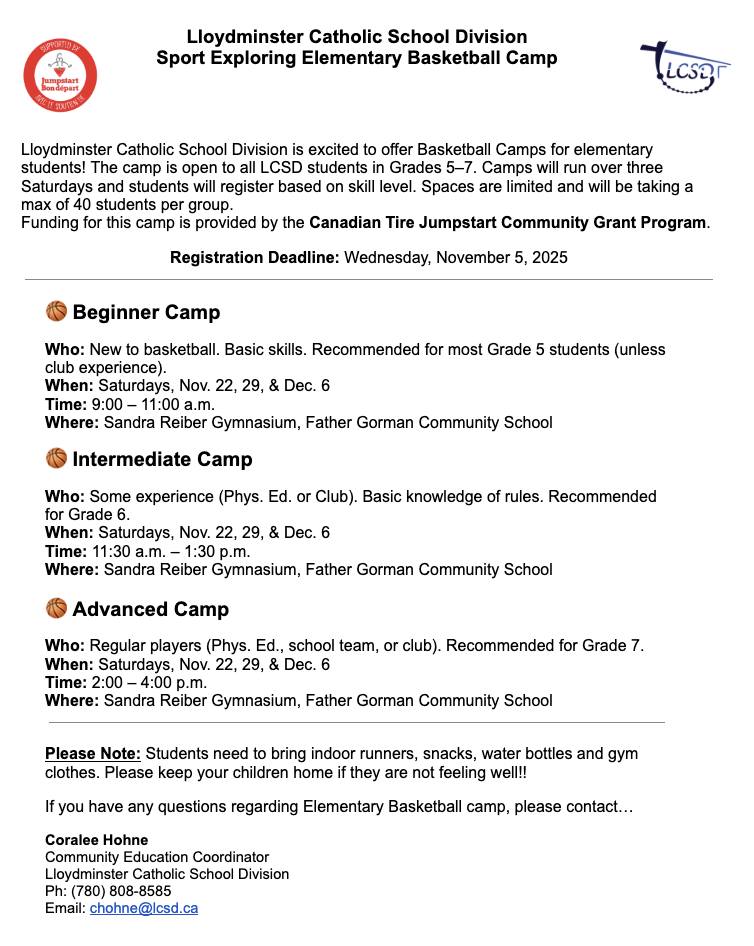 The Lloydminster Catholic School Division is excited to host Basketball Camps for Grades 5–7!