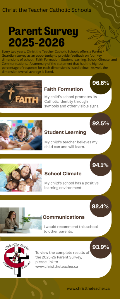 The survey invites feedback on four key dimensions of school: Faith Formation, Student Learning, School Culture, and Communications.