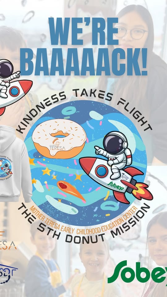 \ud83c\udf69\ud83d\ude80 Mother Teresa ECEC: Kindness Takes Flight \u2013 5th Annual Donut Mission! \ud83d\ude80\ud83c\udf69\nIt\u2019s here! The 5th Annual Donut Kindness Campaign is blasting off, and our students are ready to launch kindness higher than ever. For five incredible years, this student-driven initiative\u2014made possible through our valued partnership with Sobeys\u2014has turned creativity, learning, and community spirit into over $29,000 donated to local organizations. This year, we\u2019re aiming to soar past $40,000\u2014and we need our community on board to make it happen!\n\nHow the mission works:\n* February 1\u20135: Round 1 \u2013 3 classes + Mother Teresa Donut\n* February 6\u201310: Round 2 \u2013 4 classes\n* February 11\u201315: Round 3 \u2013 3 classes + Mother Teresa Donut\n\nEach classroom is designing unique, out-of-this-world donut creations, combining learning, teamwork, and imagination. Lloydminster Sobeys generously donates 50\u0025 of sales to local charities, ensuring every bite counts toward making a difference.\n\nSupporting the mission:\n* Grab a delicious donut during one of the three sales rounds.\n* Share donuts with others or challenge a friend, business or organization to get involved. \n* Show your spirit with Donut Kindness Campaign clothing, with a portion of proceeds contributing to our donation goal.\n\n\ud83d\udc99 Why this matters: This is more than donuts\u2014it\u2019s hands-on, student-driven learning. It\u2019s about showing children the power of kindness, teamwork, and giving back. It\u2019s about our community lifting these kids up as they launch their mission of generosity into the world. And it\u2019s fun, delicious, and inspiring!\nLet\u2019s help these kindness rockets take flight for the 5th year in a row! Together, we can make kindness soar higher than ever before.\n\nExtra special thanks to Michelle Rusteika for making all this possible. We are so proud of our staff and students! \n\nStay tuned to local media for more information and our Local Organization Fair is next Tuesday! \n\nPre-order your donuts today and join the mission:\n\ud83d\udc49 https:\/\/forms.gle\/GwxGH26FKHZ9ww9u9″,”delight_ranges”:[],”image_ranges”:[],”inline_style_ranges”:[],”aggregated_ranges”:[],”ranges”:[{“entity”:{“__typename”:”ExternalUrl”,”__isEntity”:”ExternalUrl”,”url”:”https:\/\/l.facebook.com\/l.php?u=https\u00253A\u00252F\u00252Fforms.gle\u00252FGwxGH26FKHZ9ww9u9&h=AT0wCTgQ7Y5V-R-YmIWgjd-bdTCfE7pZbNWZ10mF_5udTZPQRGXUxW7V7uJozWS4bnQMfDYvmYG1oRjctgBLPe55u5Xd_gOiw2MKsNd_IGMIV5iaGz3sTjO2NG_thbITUMgElp__Dz2c9nxSN9JaRy1qvmkjxJySpTx4hQ&s=1″,”external_url”:”https:\/\/forms.gle\/GwxGH26FKHZ9ww9u9″,”__isWebLinkable”:”ExternalUrl”,”web_link”:{“__typename”:”ExternalWebLink”,”url”:”https:\/\/forms.gle\/GwxGH26FKHZ9ww9u9″,”fbclid”:null,”lynx_mode”:”ASYNCLAZY