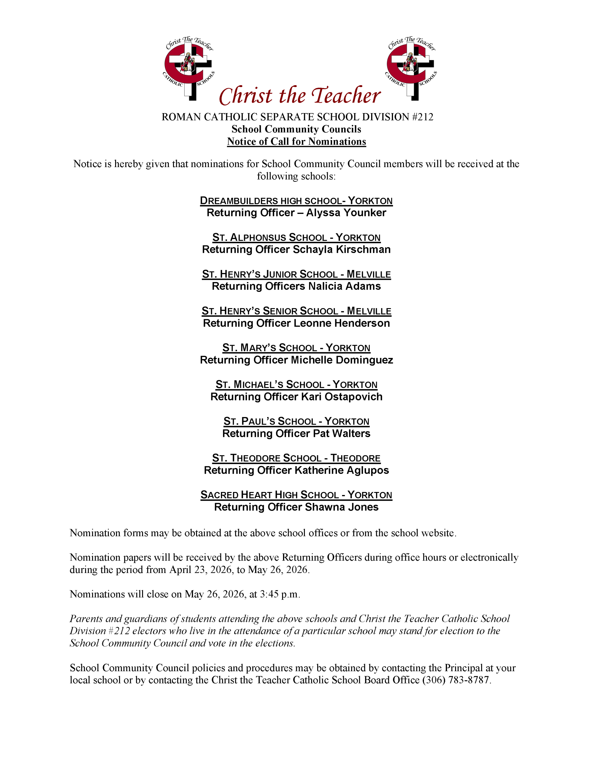 Nominations for School Community Councils (SCCs) will be received at schools until May 26, 2026 at 3:45 pm.